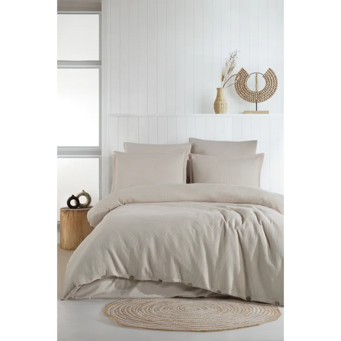 Aden mini waffle textured duvet cover set gives your bed a comfortable and inviting feeling with its softness and gentle texture, making it a comfortable option for sleeping. 75% Cotton 25% Modal STANDARD SIZE: Duvet cover/duvet cover 200x220cm Bed sheet 260x280cm Pillowcase pillowcase 50x70cm (2) Decorative pillow case (50x70 cm (2) QUEEN SIZE: Duvet cover 220x240cm Bed sheet 270x310cm Pillowcase pillowcase 50x70cm (2) Decorative pillow case (50x70 cm (2)