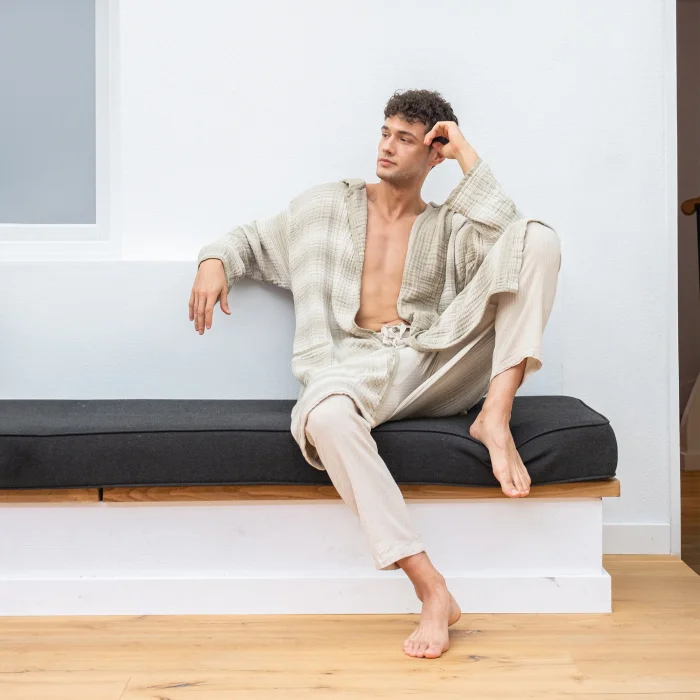 Thanks to its linen texture, it gives a unique look both at home and in daily life.    85% Cotton 15% Linen 1 (M) 2 (L) 3(XL)