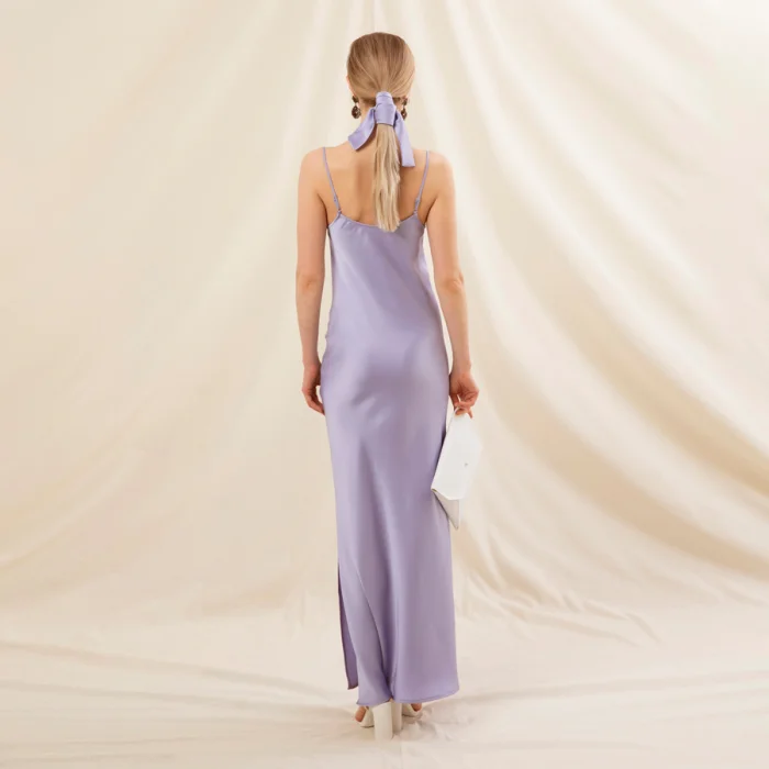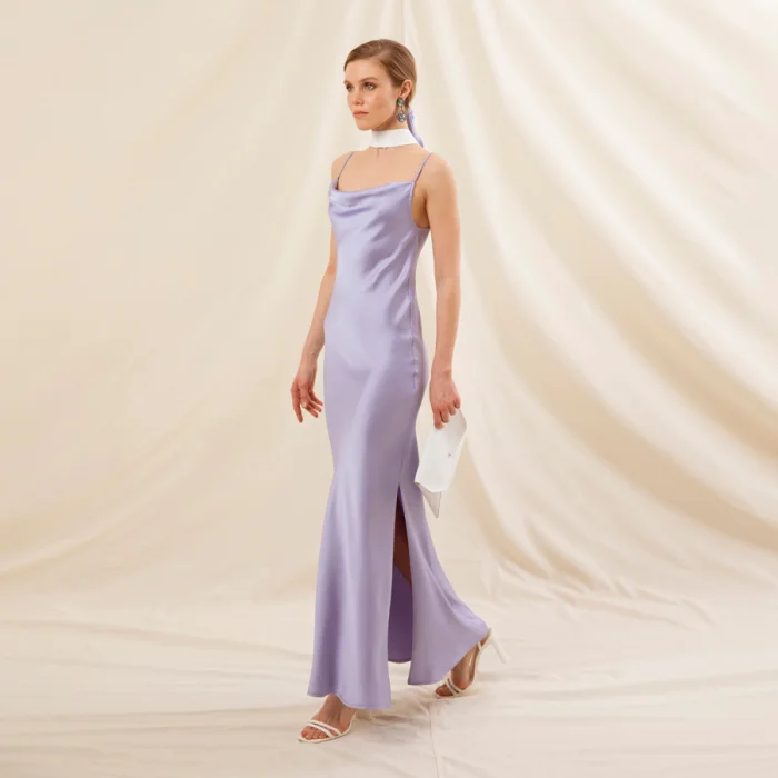 Cowl neck, spagetti strapped, ankle lenght Satine Dress, pops out of an envelope Pu leather clutch.