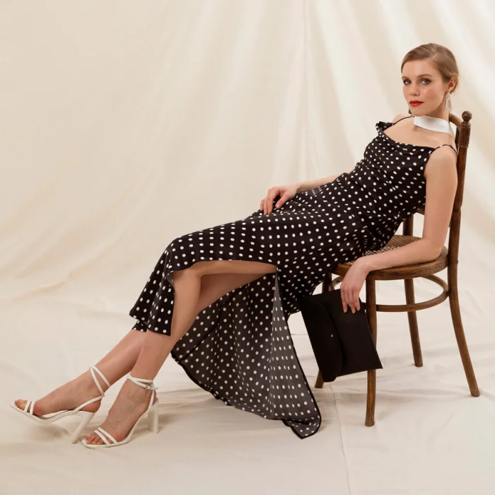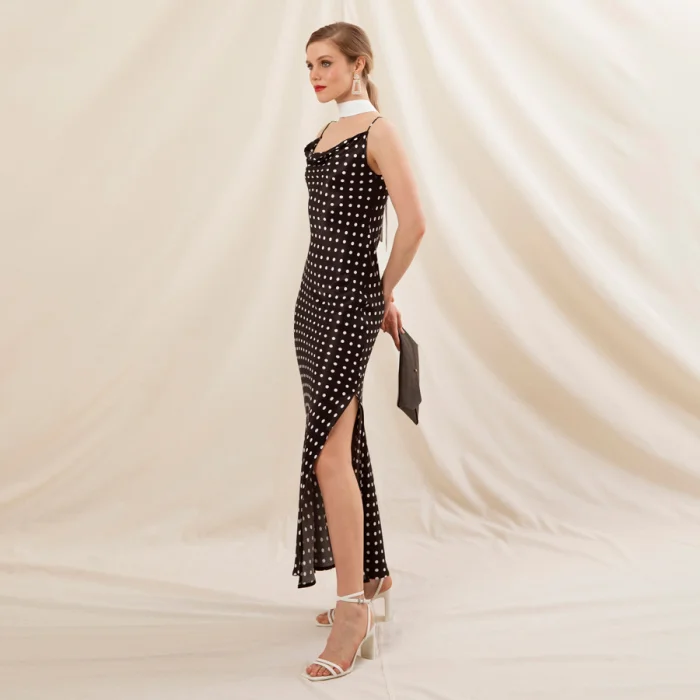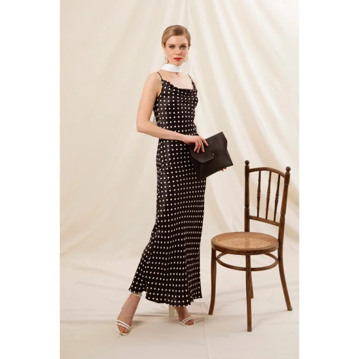 Cowl neck, spagetti strapped, ankle lenght Satine Dress, pops out of an envelope Pu leather clutch.