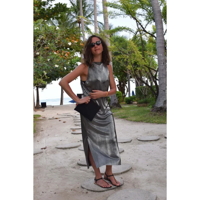 Double Sided, side seam slitted, krinkle non-iron dress. Pops out from a C-ya Bag.