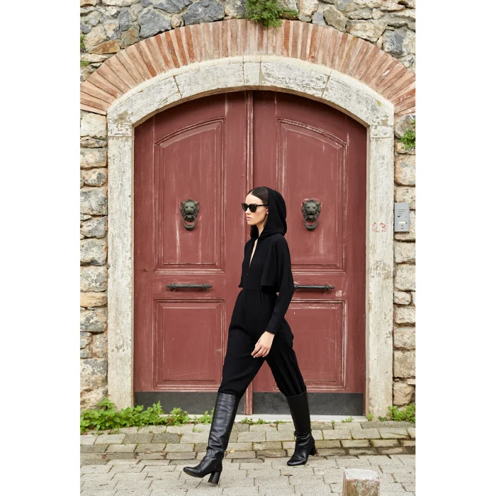 Bat wing sleeve, zippered, hooded, overall.