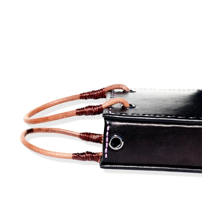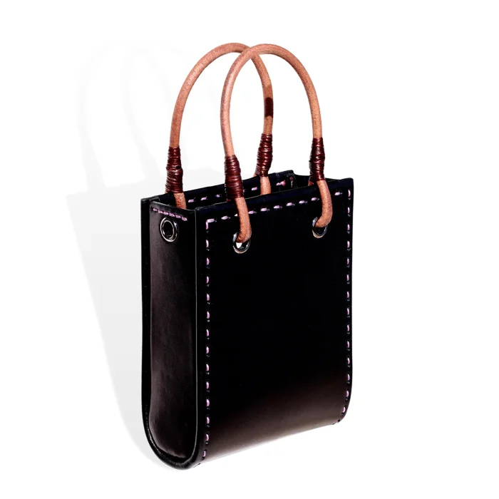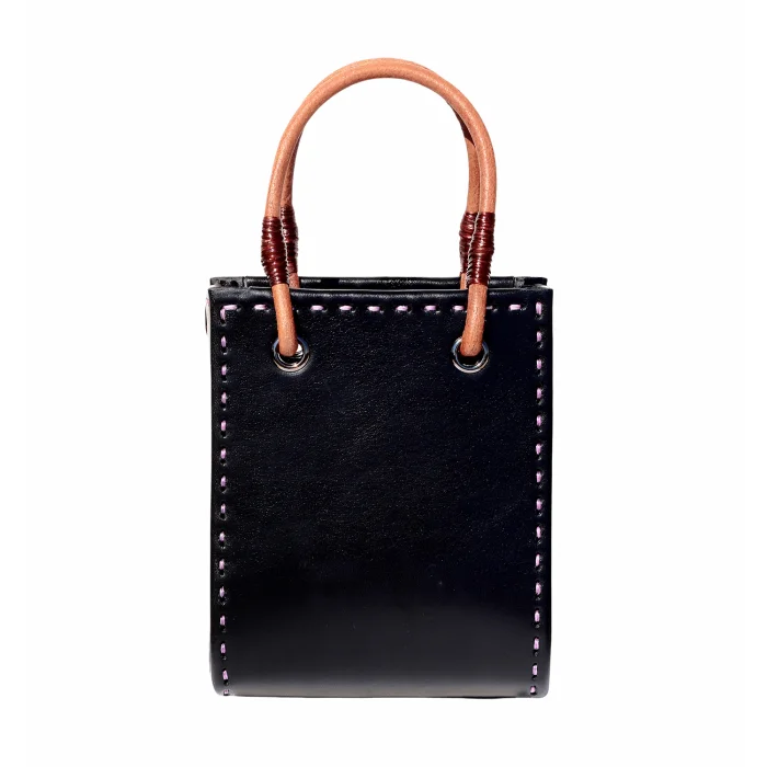 Hand stitched leather bag Dimensions: W 150mm, H 180mm, D 60mm Raw leather handles and optional shoulder strap 900mm Laminated textile lining