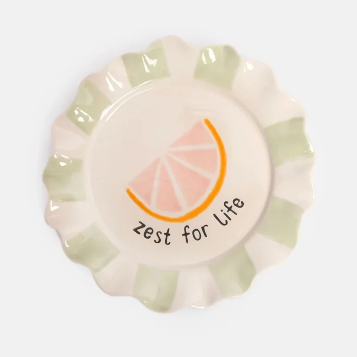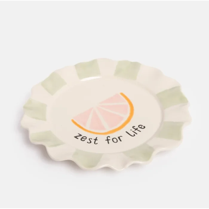 This vibrant "Zest for Life" grapefruit hand-glazed plate, finished with a beautiful, scalloped rim with a soft green stripe design, is a must-have for any kitchen. This plate is crafted from durable, heat-resistant glazed stoneware. It is dishwasher and microwave safe. Please note these items are a hand finished item, and each will display their own unique characteristics. Slogans are unglazed to stand out as a design feature.