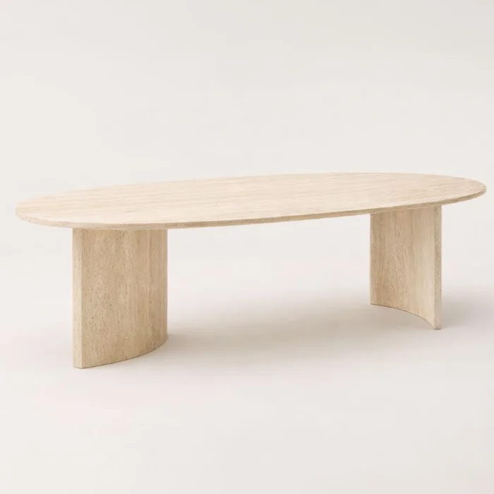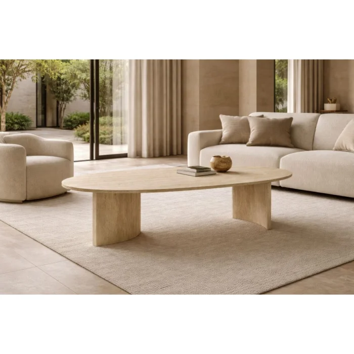soft oval form and warm texture of natural travertine stone.Thanks to its flowing lines, it offers a more comfortable feeling of circulation in the space.