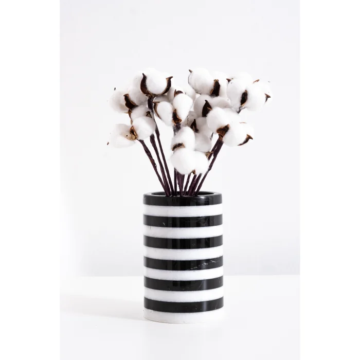 The black and white travertine marble vase, a staple of modern and minimalist décor, harmoniously complements both classic and contemporary interiors. Handcrafted with meticulous attention to detail, this special piece offers a truly unique appearance.