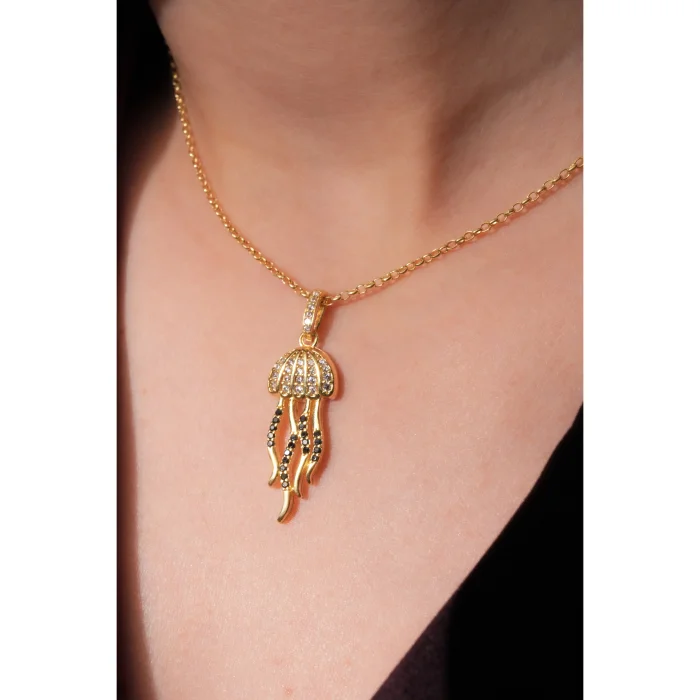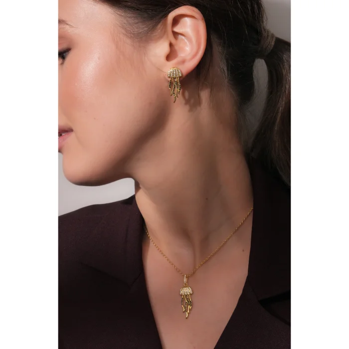 The gold-plated bronze pendant, adorned with precious stones, offers an elegant integrity with the gold-plated doc chain on silver.