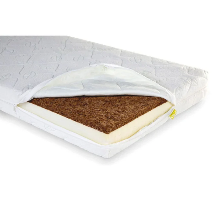 Material: Coconut fibre layer and polyether foam Tick: 67 % Polyester and 33 % Viscose
