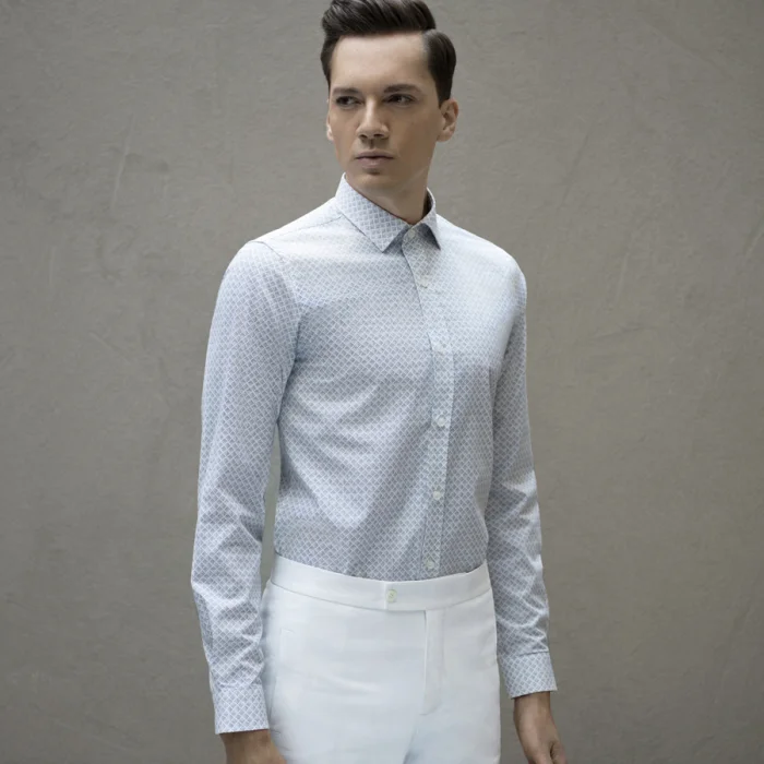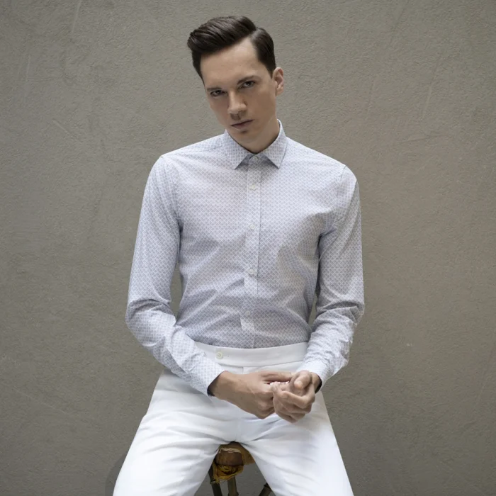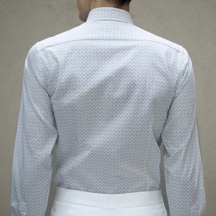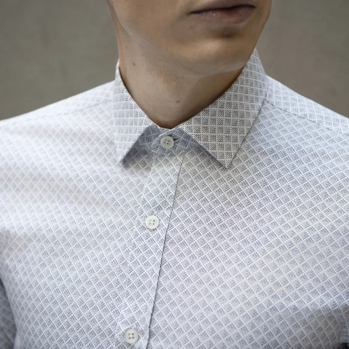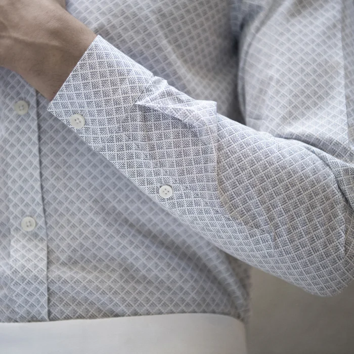 Geometric print. 100% cotton. Slim fit. Small collar. One button cuff.