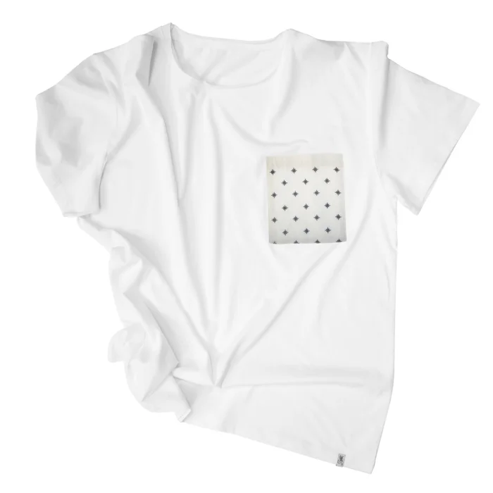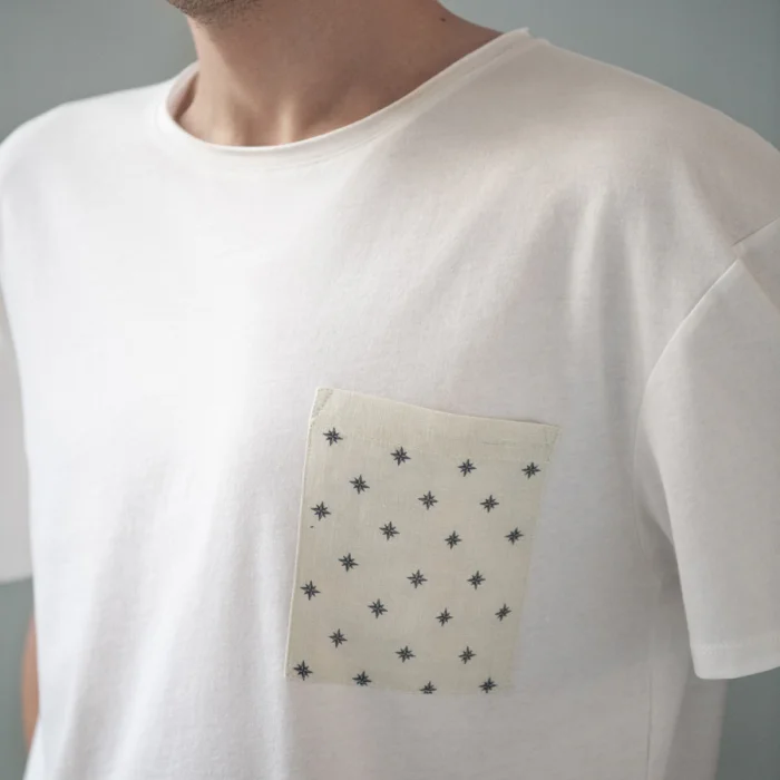 Compass printed linen pockets under marine theme. Over size cut. Raw edge neck.