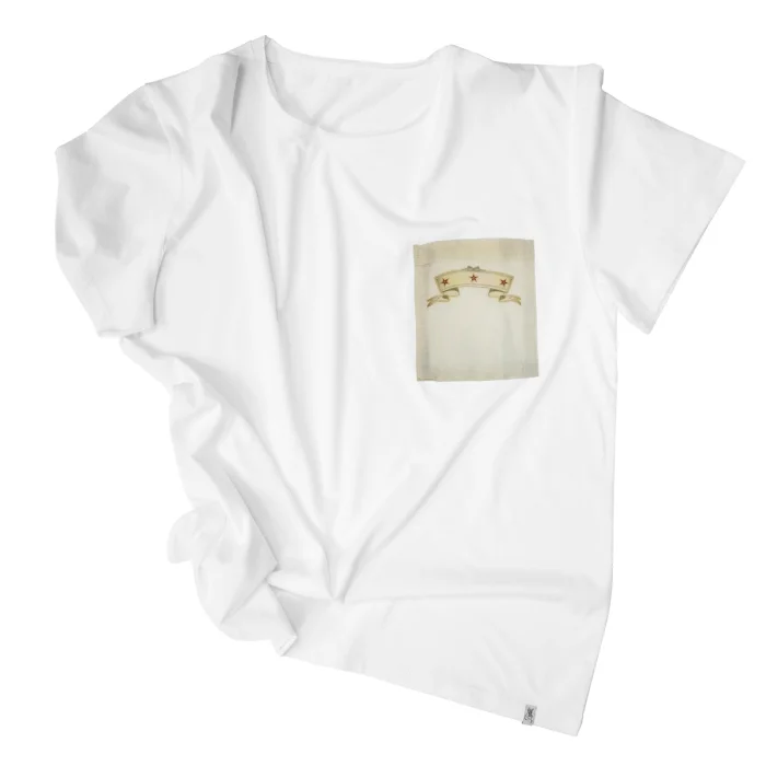 Material: 100% Cotton Maintenance: 30 degrees in the machine, steam iron, do not throw it to dry, hang it to dry. Model Dimensions: Height: 1.89cm / Bust: 95 cm / Waist: 75 cm / Hips: 96 cm / Neckline: 40 / Size L T-shirt with linen pockets with a starry pennant pattern. Oversize cut.