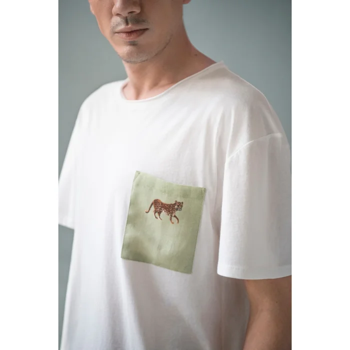 Material: 100% Cotton Maintenance: 30 degrees in the machine, steam iron, do not throw it to dry, hang it to dry. Model Dimensions: Height: 1.89cm / Bust: 95 cm / Waist: 75 cm / Hips: 96 cm / Neckline: 40 / Size L T-shirt with leopard print linen pockets. Oversize cut.