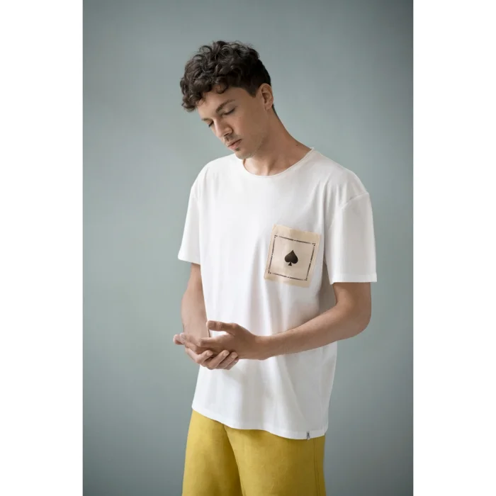 Material: 100% Cotton Maintenance: 30 degrees in the machine, steam iron, do not throw it to dry, hang it to dry. Model Dimensions: Height: 1.89cm / Bust: 95 cm / Waist: 75 cm / Hips: 96 cm / Neckline: 40 / Size L Spade card patterned linen pocket t-shirt. Oversize cut.