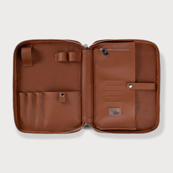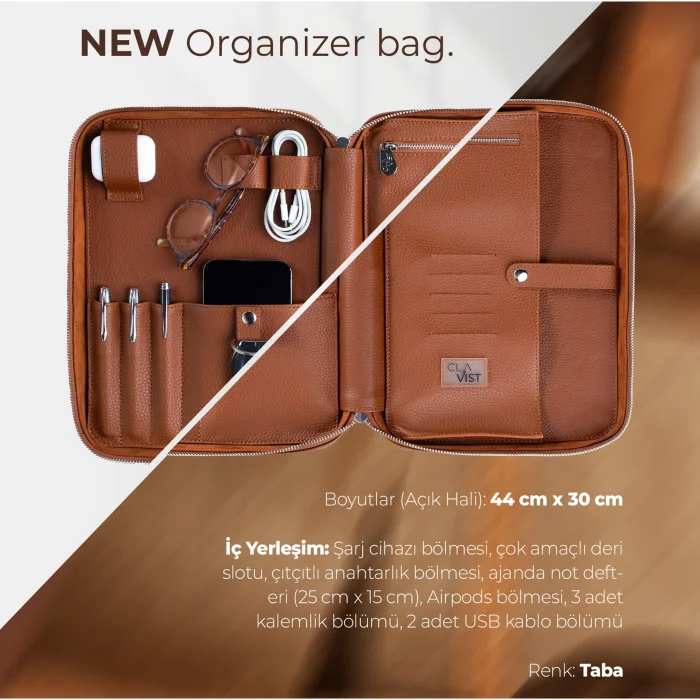 Interior Layout: Charger compartment, multi-purpose leather slot, keychain compartment with snap, organizer notepad (25 cm x 15 cm), Airpods compartment, 3 pen holders, 2 USB cable sections