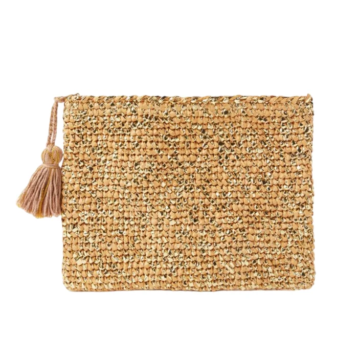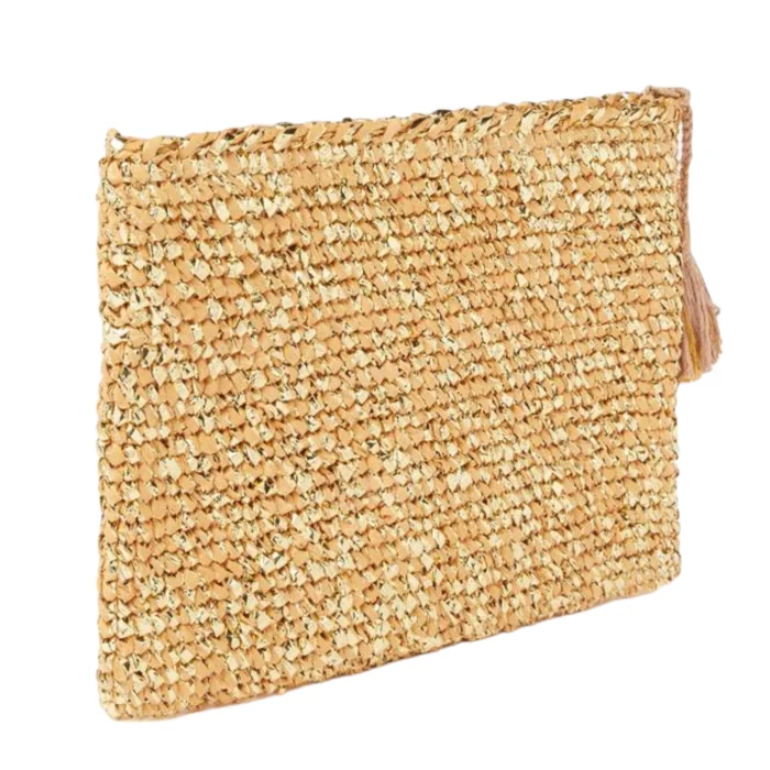 Hand-knitted clutch form bag with silvery raffia rope with tassel detailing.