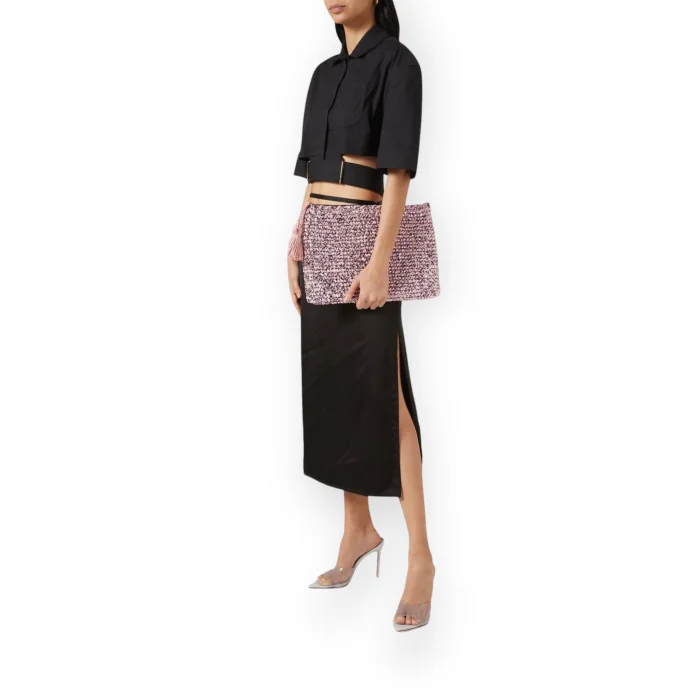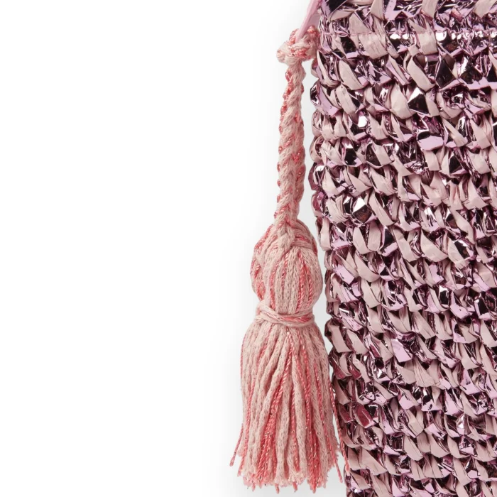 Hand-knitted clutch form bag with silvery raffia rope with tassel detailing.