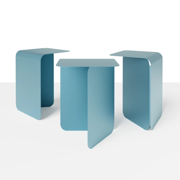 A side table that provides a multi-purpose use with two different heights. It offers a clean and industrial visuality with its bent metal sheet body and electrostatic painted colored surfaces.