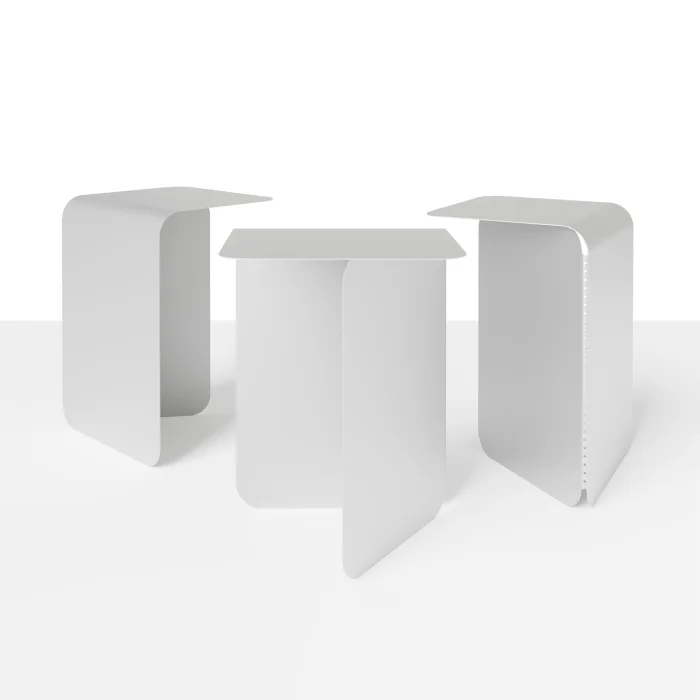 A side table that provides a multi-purpose use with two different heights. It offers a clean and industrial visuality with its bent metal sheet body and electrostatic painted colored surfaces.