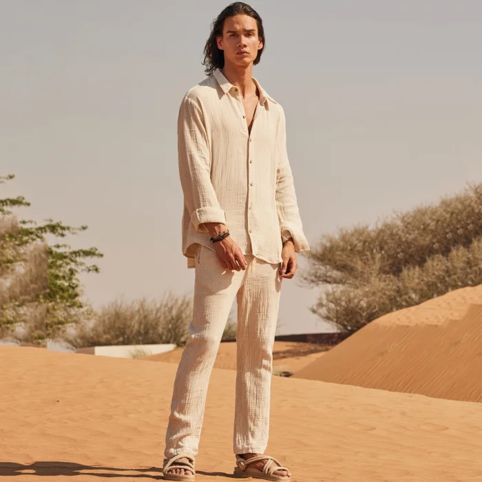 Shirt: -Relaxed fit, -Made of 100%Cotton muslin, -Spread collar, -Button fastening, -Buttoned cuffs, -Back center pleated, -Quick-drying, -Does not require ironing \ Pant: -Relaxed fit, -Made of 100%Cotton muslin, -Spread collar, -Button fastening, -Buttoned cuffs, -Back center pleated, -Quick-drying, -Does not require ironing