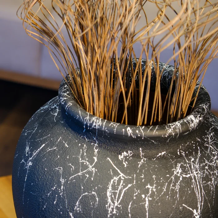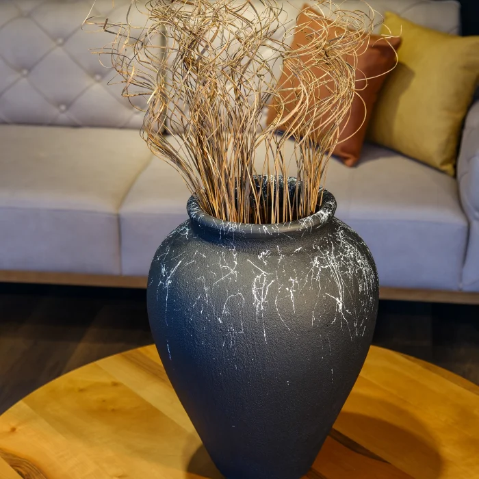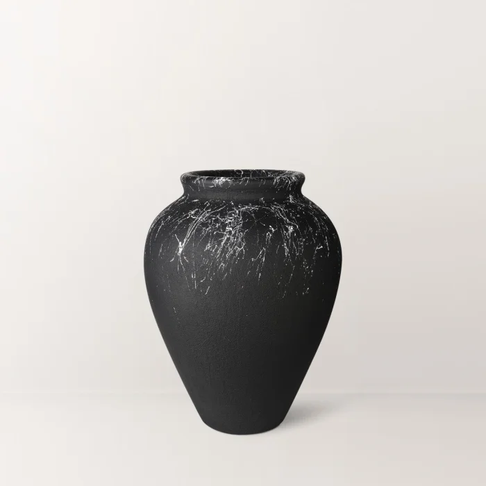 A perfect combination of aesthetics and elegance! This vase made of terracotta material will add an artistic touch to your home with its elegance and textured design. The elegant black surface is enriched with elaborate details, decorated with white marble patterns. Properties: Terracotta Material: Durable and high-quality terracotta material is ideal for long-lasting use. Black Color: The perfect choice of black color to create a modern and stylish atmosphere. White Marble Pattern: The white marble pattern on the vase will bring elegance and luxury to your home. Decorative Textures: The textured design on the surface enhances the aesthetic appeal of the vase. This gorgeous vase is the perfect option to add a stylish touch to your home or office. It will be a wonderful decoration item not only with flowers, but also with dry branches or artificial flowers. Enjoy this exquisite terracotta vase to create a distinctive elegance in every corner of your home.