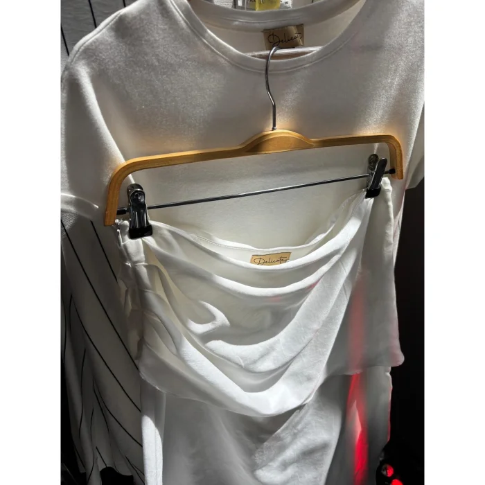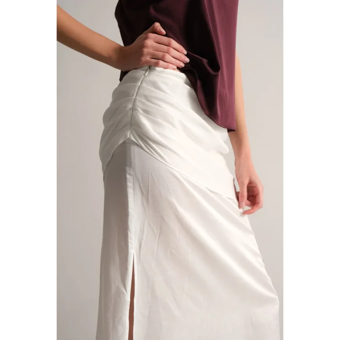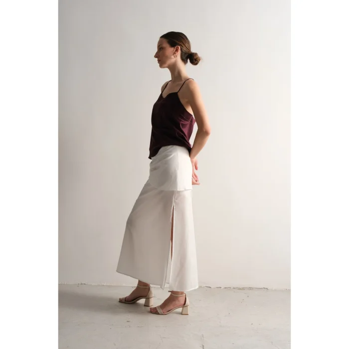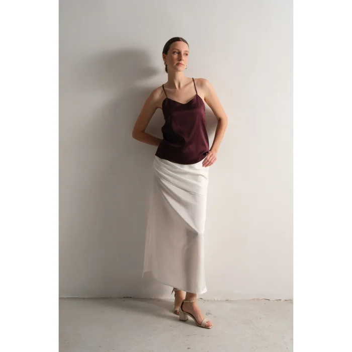 Thanks to its double-layer design, it is lined and offers a transparent appearance without showing inside. The upper part is obtained matte by using the reverse of the fabric, the lower part of the skirt is slightly shiny due to the property of silk fiber.