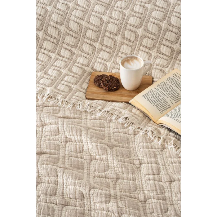 modern design approach with comfort, Perge muslin quilt attracts attention with its simple and elegant lines. Ideal for those who adopt a minimalist decoration approach, this collection combines the power of simplicity with a soft cotton texture. The upper and lower textures are two layers of 100% cotton muslin weaving. There is fiber (polyester) filling on the inside. Our product, which has a 5-layer weaving, offers a comfortable sleep with its fluffy filling. With its breathable structure, it prevents sweating and offers all-season use. You can use it as a bedspread, blanket and quilt. It provides a long-lasting use with its double-sided texture.