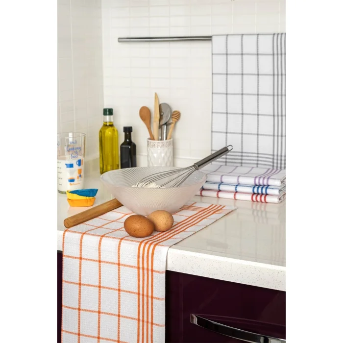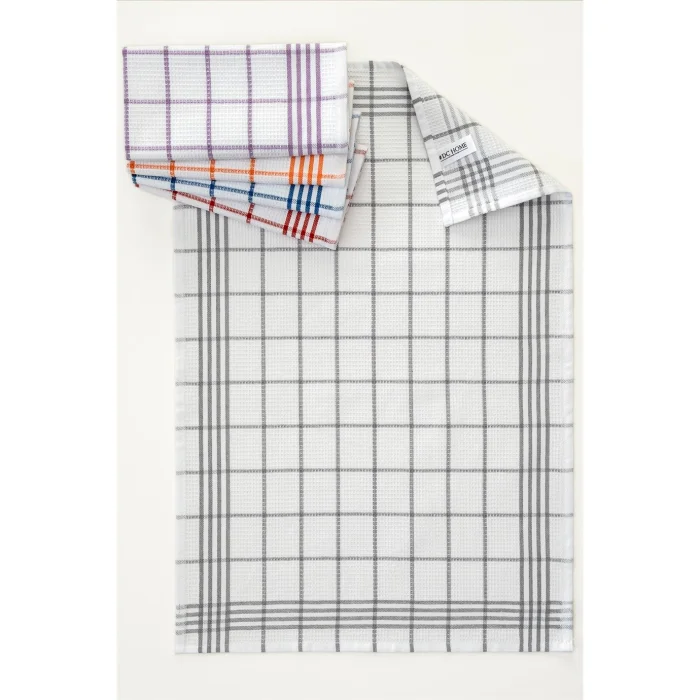 1. Our tea towels, which are made of quality cotton, have high absorbency and a soft texture. There are 5 tea towels in different colors in  our 5-piece tea towel set. The yarn is produced as dyed. In this way, there is no fading or deformation in long-term use. Our tea towels can also be used as service napkins or feeding cloths in schools.