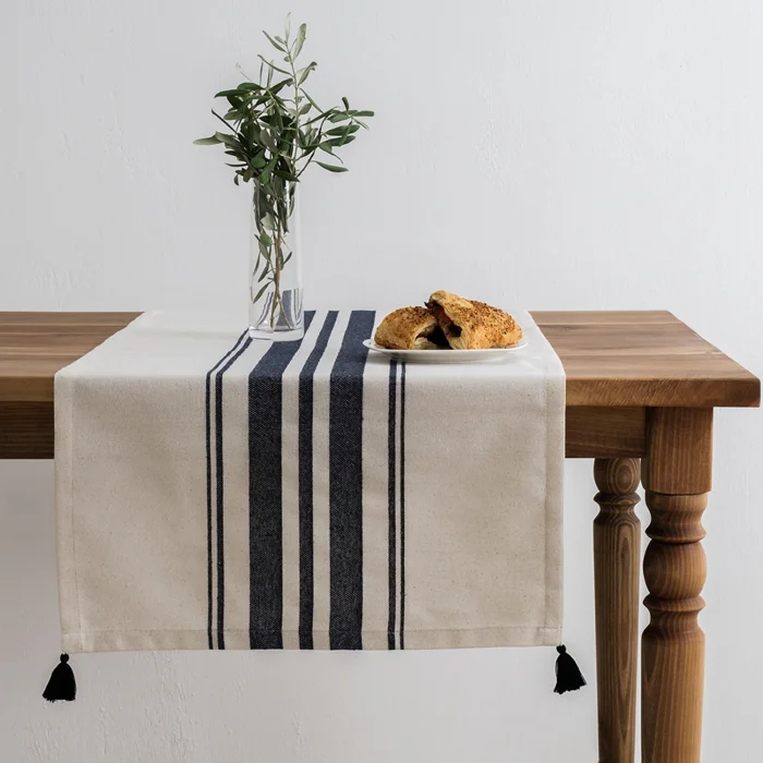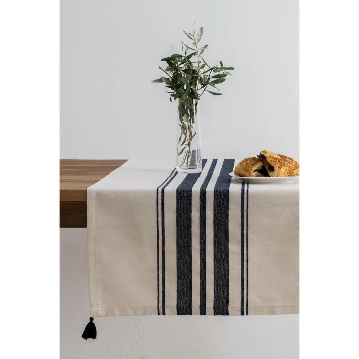 Tereza Navy Blue Runner You will catch a stylish atmosphere on your tables with our navy blue runner model, where you can get both a modern and retro look with its striped pattern. Our navy blue runner model, which has a quality and useful structure, is suitable for long-term use; It has straight stitches on all four sides. ; There are pompom details at the corners. ; Fabric Content: 65% cotton 35% polyester. ; Navy Blue Runner Size: 50 x 150 cm ; Our product is OEKO-TEX certified. ; Why Should I Buy Oeko-Tex Certified Products? Oeko-Tex certified products are products that have successfully passed all tests and approved according to international standards. ; It does not contain carcinogenic and allergenic materials. It does not irritate the skin and does not harm human health. ;