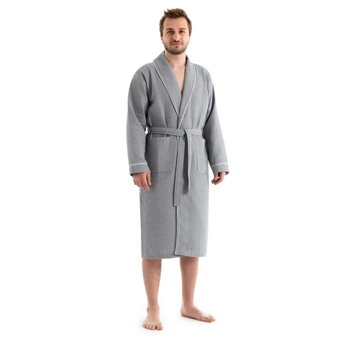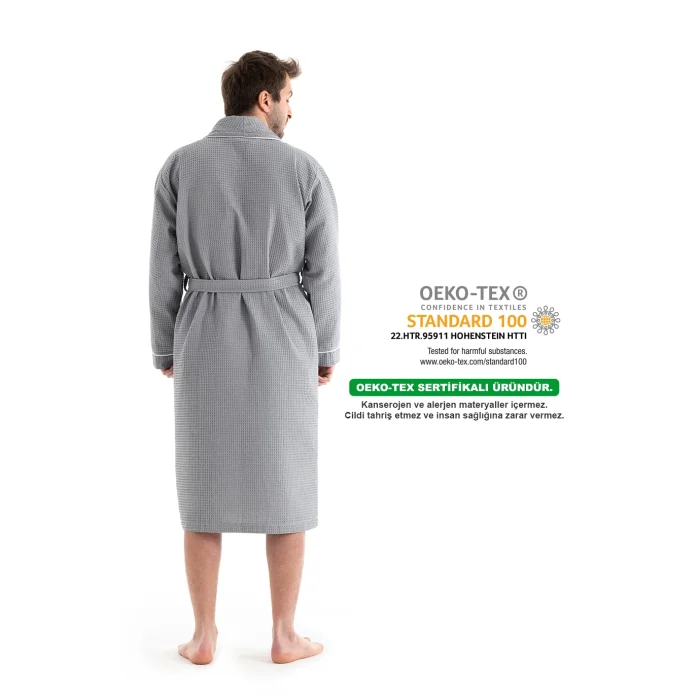 Piqué Gray Bathrobe Gray bathrobe, which is one of the most preferred colors, is specially designed. Made with premium cotton yarn The texture is soft and does not irritate your skin. It has a high moisture absorbency rate and dries quickly. Piqué gray bathrobe is a UNISEX modelSuitable for use as both women's bathrobe and men's bathrobe Package Contents 1 Piece Gray Bathrobe Bathrobe Fabric Content: 65% Cotton, 35% Polyester Our product is OEKO-TEX certified. Why Should I Buy Oeko-Tex Certified Products? - Oeko-Tex certified products are products that have successfully passed all tests and approved according to international standards. - It does not contain carcinogenic and allergenic materials. It does not irritate the skin and does not harm human health.