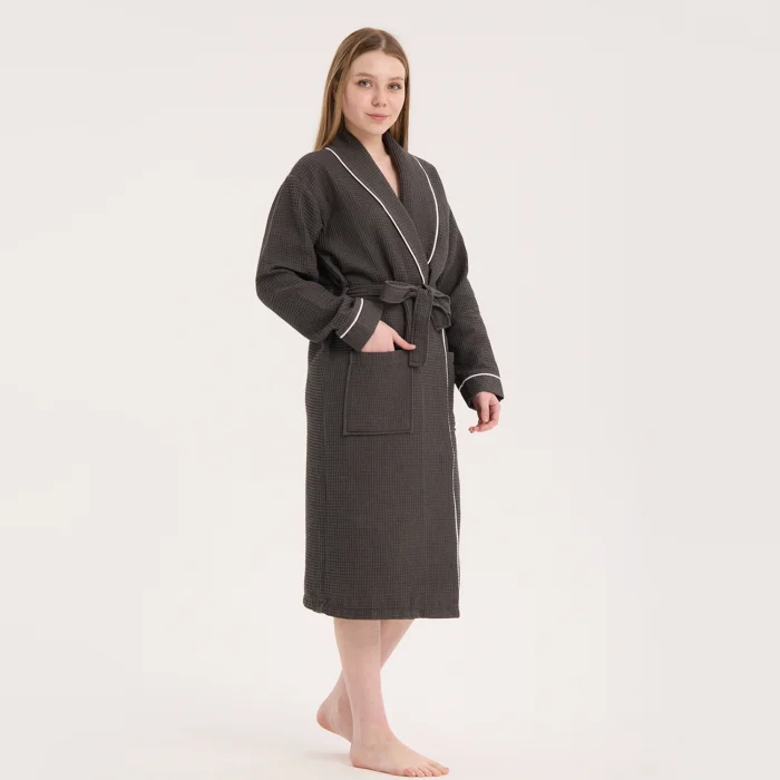Piqué Gray Bathrobe Gray bathrobe, which is one of the most preferred colors, is specially designed. Made with premium cotton yarn The texture is soft and does not irritate your skin. It has a high moisture absorbency rate and dries quickly. Piqué gray bathrobe is a UNISEX modelSuitable for use as both women's bathrobe and men's bathrobe Package Contents 1 Piece Gray Bathrobe Bathrobe Fabric Content: 65% Cotton, 35% Polyester Our product is OEKO-TEX certified. Why Should I Buy Oeko-Tex Certified Products? - Oeko-Tex certified products are products that have successfully passed all tests and approved according to international standards. - It does not contain carcinogenic and allergenic materials. It does not irritate the skin and does not harm human health.