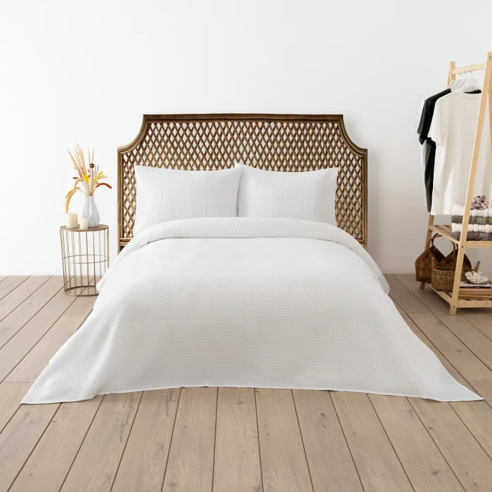 Product Specifications Material/Material: 65% Cotton 35% Polyester Size: 200x220 cm + 2x(50x70) cm Number of Pieces: 3 Pieces • Our double piqué cover has a comfortable and soft fabric structure. • Air permeability is available in the pike. It gives a feeling of coolness. • Package Contents: It consists of 3 pieces in total, 1 piqué cover and 2 pillowcases. •Color: White The DC Home Waffle Double Pique Set is made of soft cotton material for a luxurious feel. Its soft and light cotton structure provides additional comfort and durability, while the useful dimensions provide a better cover for your mattress. Our product is OEKO-TEX certified. Oeko-Tex certified products are products that have successfully passed all tests and approved according to international standards. It does not contain carcinogenic and allergenic materials. It does not irritate the skin and does not harm human health. Product Content • Pike: 200x220 cm (1 piece) • Pillowcase: 50x70 cm (2 pieces) Use and Care Information • Washable at 30 °C. • It can be thrown into the dryer at low speed. • Ironing can be done at low temperatures. • Do not use bleach.