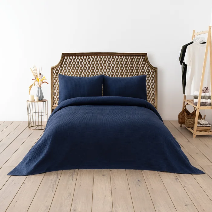 Product Specifications Material/Material: 65% Cotton 35% Polyester Size: 200x220 cm + 2x(50x70) cm Number of Pieces: 3 Pieces • Our double piqué cover has a comfortable and soft fabric structure. • Air permeability is available in the pike. It gives a feeling of coolness. • Package Contents: It consists of 3 pieces in total, 1 piqué cover and 2 pillowcases. •Color: Navy Blue DC Home Waffle Double Piqué Set is made of soft cotton material for a luxurious feel. Its soft and light cotton structure provides additional comfort and durability, while the useful dimensions provide a better cover for your mattress. Our product is OEKO-TEX certified. Oeko-Tex certified products are products that have successfully passed all tests and approved according to international standards. It does not contain carcinogenic and allergenic materials. It does not irritate the skin and does not harm human health. Product Content • Pike: 200x220 cm (1 piece) • Pillowcase: 50x70 cm (2 pieces) Use and Care Information • Washable at 30 °C. • It can be thrown into the dryer at low speed. • Ironing can be done at low temperatures. • Do not use bleach.