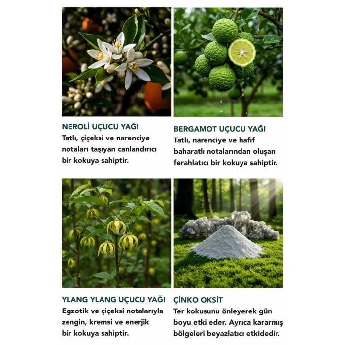 Your Skin Benefit: Provides a fresh floral scent that lasts all day. Naturally combats underarm sweat odor. Blending citrus freshness with floral sweetness, it has a refreshing and exotic scent. It offers a whitening effect when applied to dark areas.
