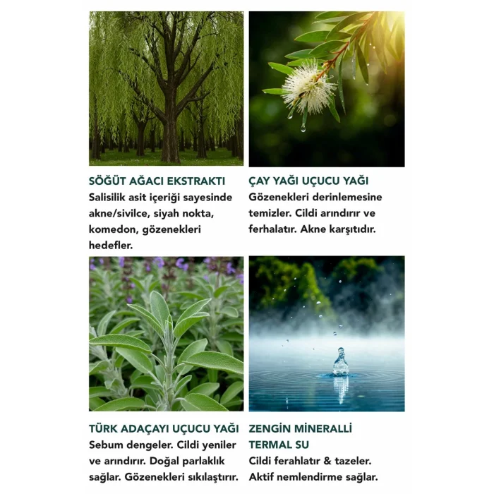 • Featured Ingredients: Thermal Water; Tea Tree Essential Oil, Willow Extract, Rosemary Essential Oil, Eucalyptus Essential Oil, Birch Leaf Extract, Green Tea Extract, Juniper Essential Oil, Sage Essential Oil, Chamomile Extract, Lavender Essential Oil, Frankincense Essential Oil, Immortelle Extract, Myrtle Water, Rose Water, Aloe Vera Gel, Panthenol (Vitamin B5), Niacinamide (Vitamin B3), Hyaluronic Acid, Vitamin E