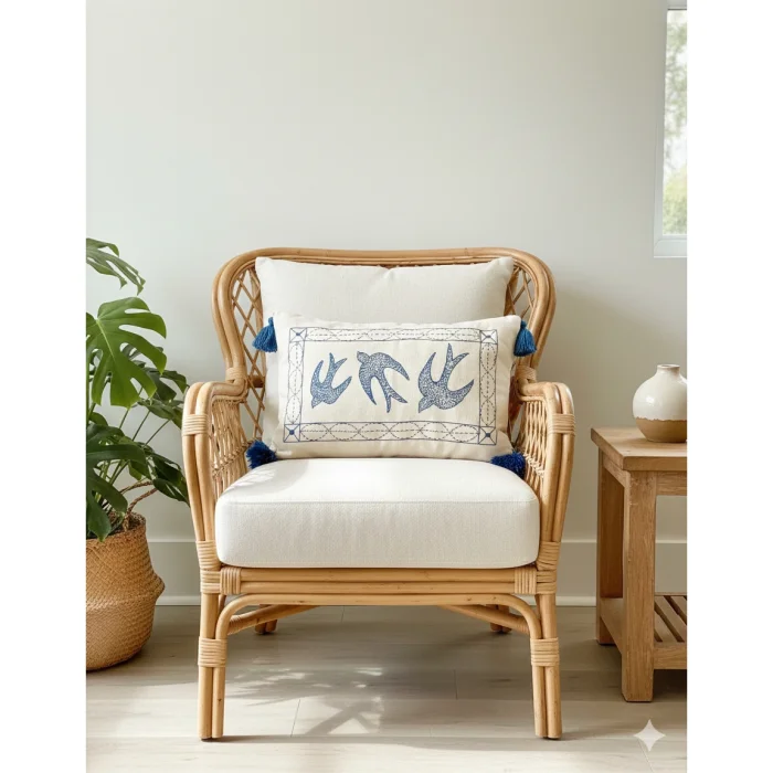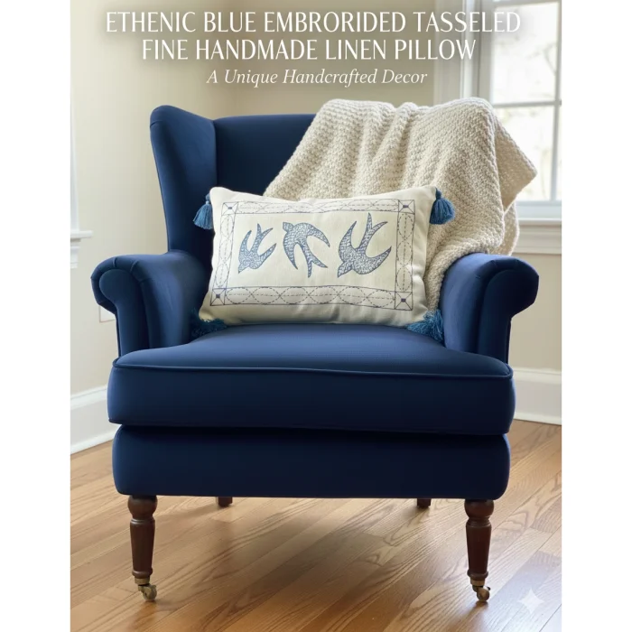 Designed to add an artistic touch to your living space, this custom cushion cover features traditional bird motifs meticulously crafted on 100% natural linen fabric. With its elegant blue tones and handmade tassels in the corners, it fits perfectly into both bohemian and modern decoration styles.