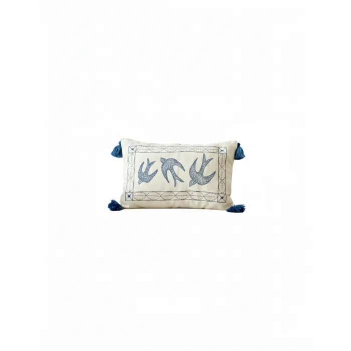 Handmade Blue Ethnic Bird Embroidered Linen Cushion Cover - Tasseled Waist Pillow