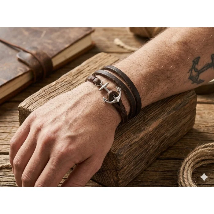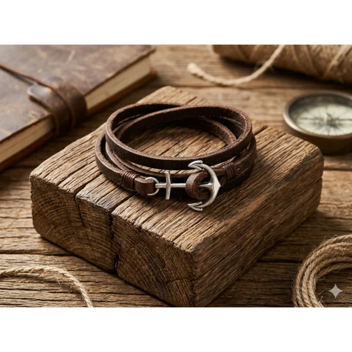 Product: "men's Brown Wrap Leather Bracelet With Anchor Clasp"