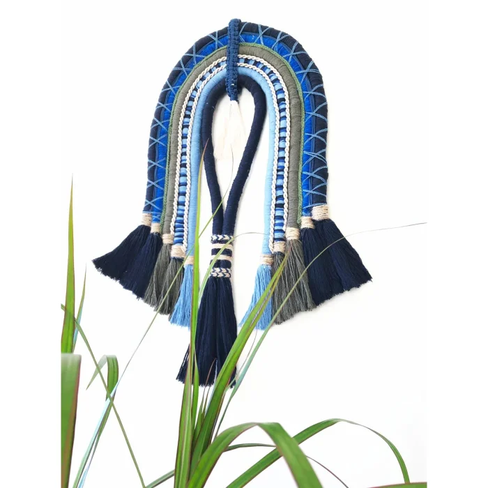 This stylish and modern macrame wall ornament adds a warm and elegant touch to your home with its boho style. This unique 62x32 cm piece creates a rustic summer vibe with its blue tones and tufted details. Reflecting modern mid-century design, this macrame wall art fits perfectly into both traditional and contemporary decorating styles. A perfect gift alternative for your home, this piece brings originality and a spacious atmosphere to your space.