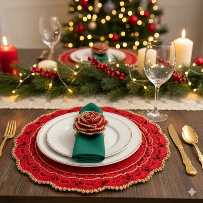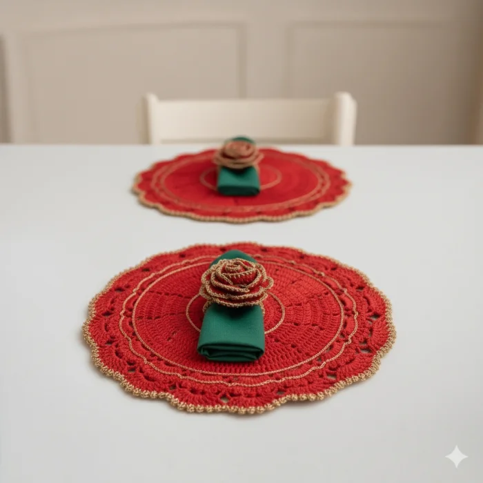 Crocheted Red Gold Detailed Supla and Napkin Ring Set Set for New Year's Table
