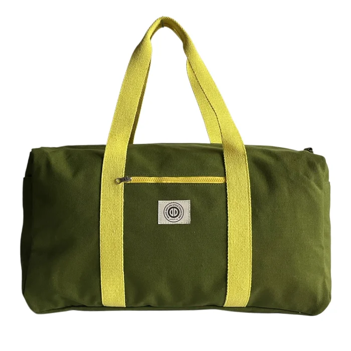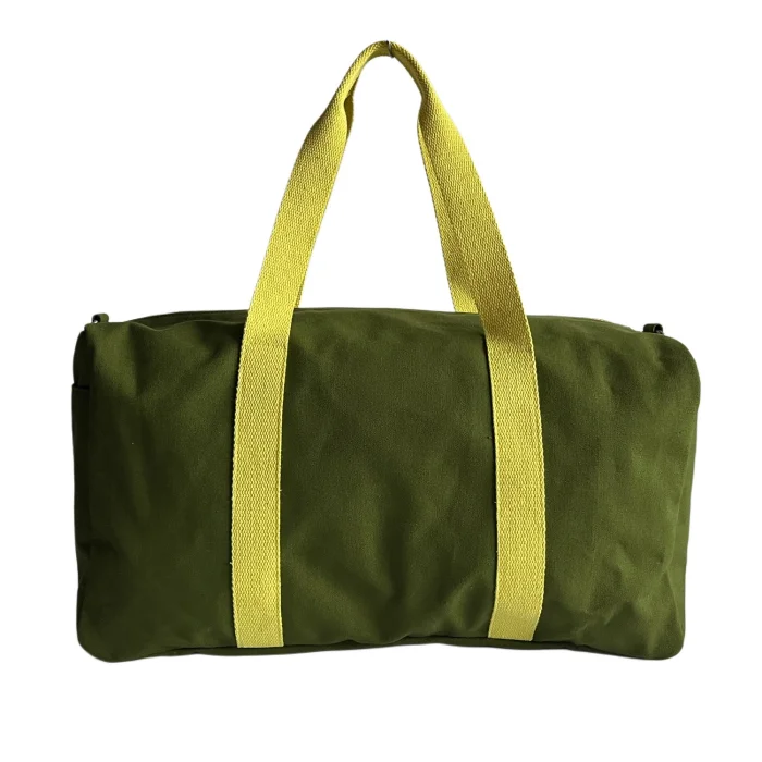 Cotton canvas fabric, bone tooth zippers, snap front pocket, extra zippered pocket inside, adjustable shoulder strap according to body size, snap pockets on both sides