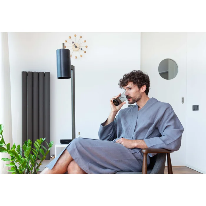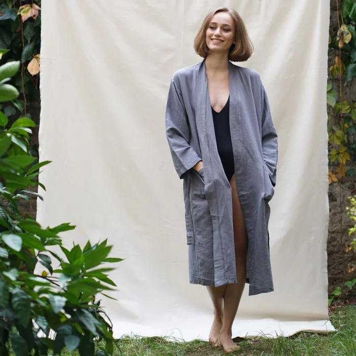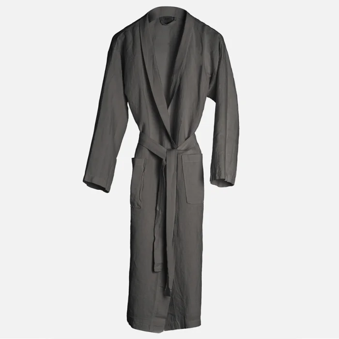 Linen bathrobe with belt and front pockets.Comfortable fit.