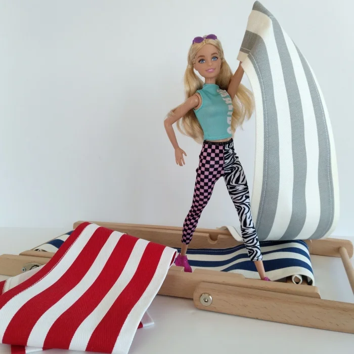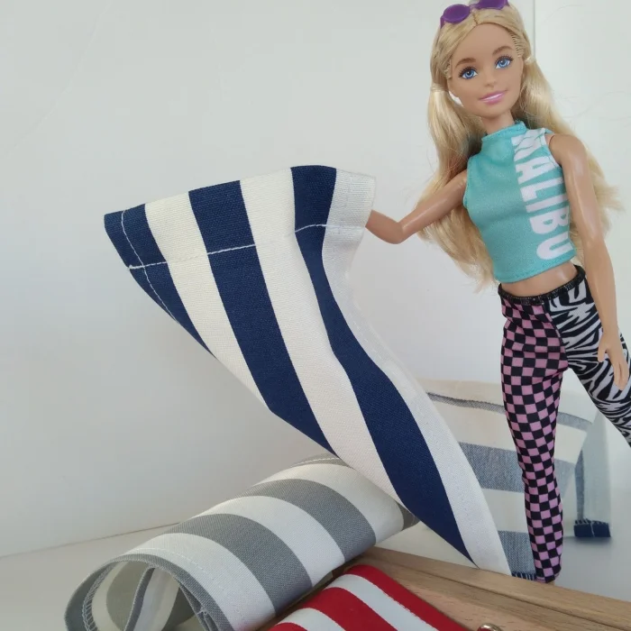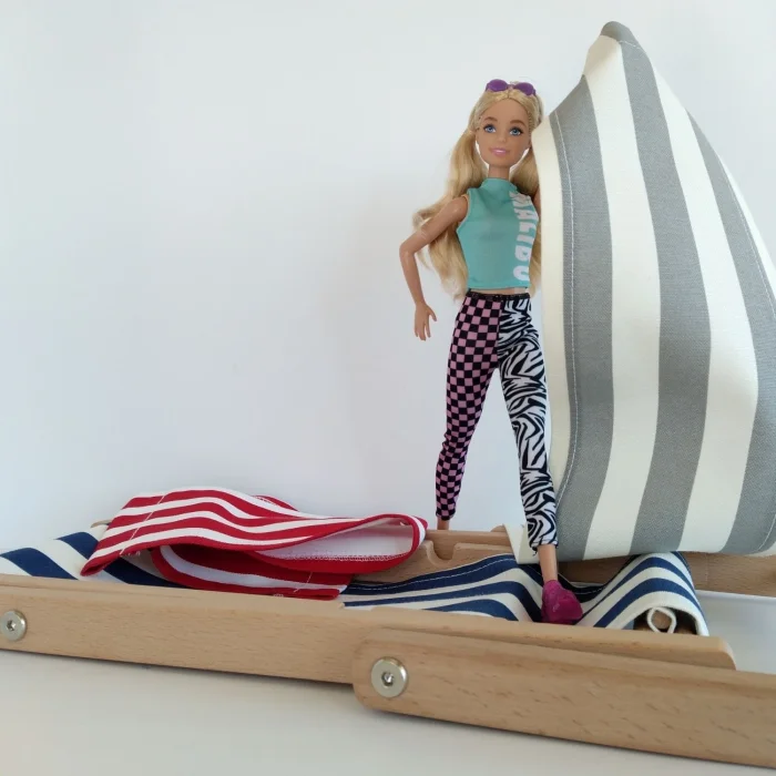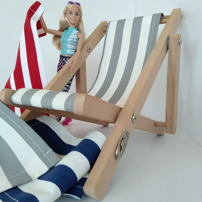 Game & Hobby Doll Seat. Fun Natural Children's Gift. Natural solid wood doll seat including three cushions. Doll lounge chair frame natural solid wood 20*30*h:27cm. Seat weight including cushion 523gr. Box weight 900gr. Seat cushion, indoor( indoor) upholstery fabric. One (1) red-and-white striped cushion On sale of the product is one (1) navy blue-white striped cushion Included in the sale of the product is one (1) gray-and-white striped cushion and one (1) wooden doll seat. The doll is used for décor purposes, the product is not included in our sale. Product: Designer Game Natural Wooden Doll Chair Including 3 Cushions