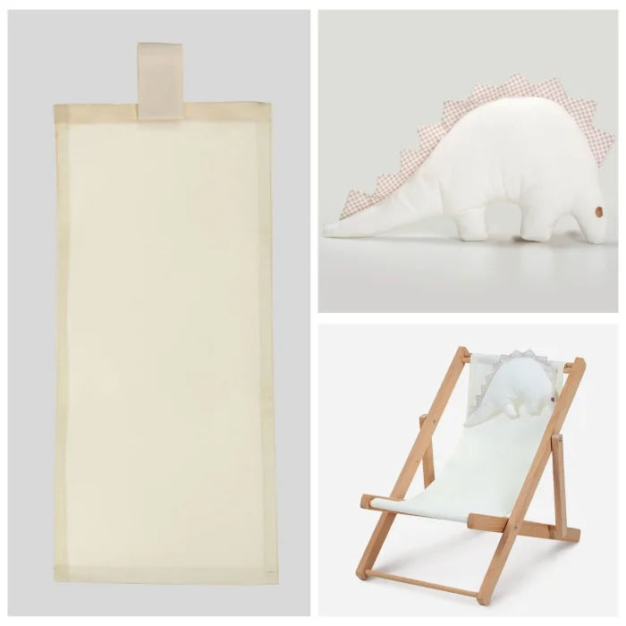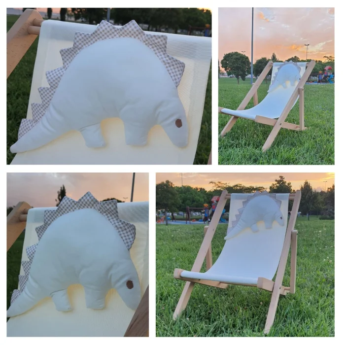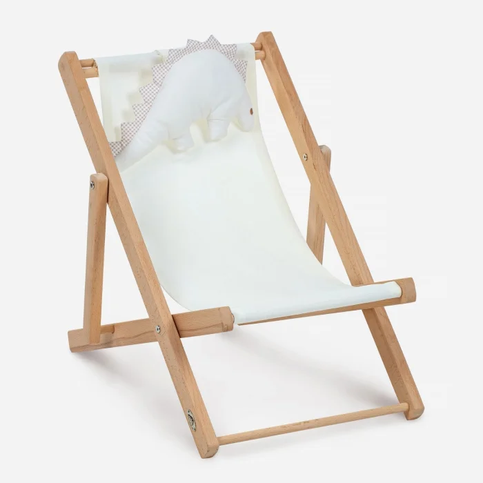Two-stage solid wood fun natural children's lounge seat. Dino pillow toy cream - beige plaid and cream cushion included.