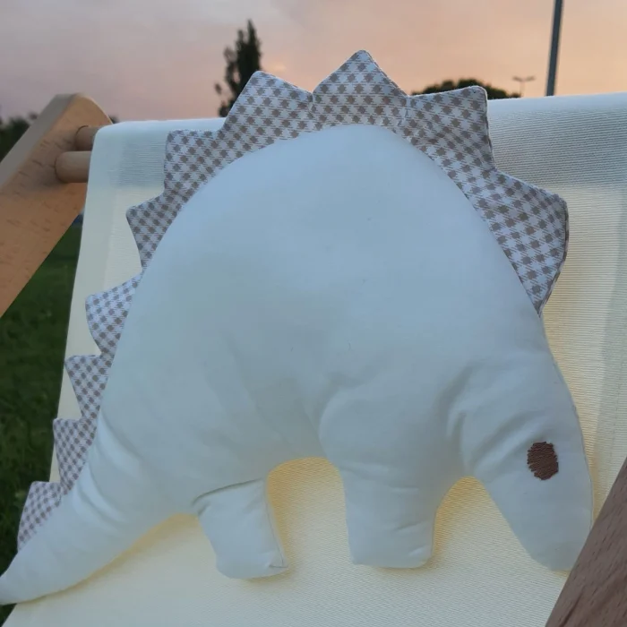 Dino pillow fiber filled, cream beige plaid, cotton thread hand embroidery on the eye. Dino pillow toy size, Width 34cm.
