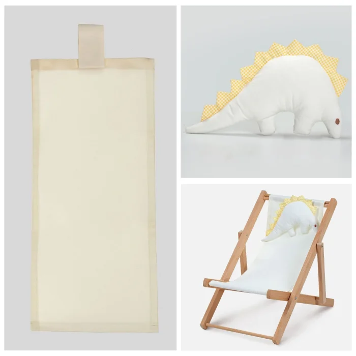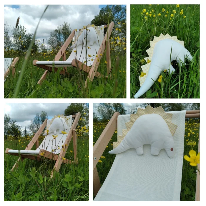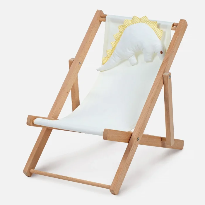 Two-stage solid wood fun natural children's lounge seat. Dino pillow toy cream - beige plaid and cream cushion included.