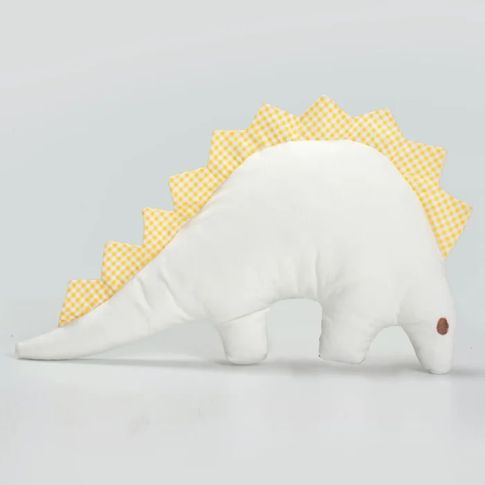 Dino pillow fiber filled, cream beige plaid, cotton thread hand embroidery on the eye. Dino pillow toy size, Width 34cm.