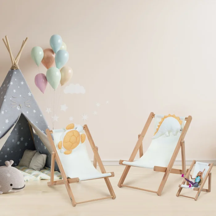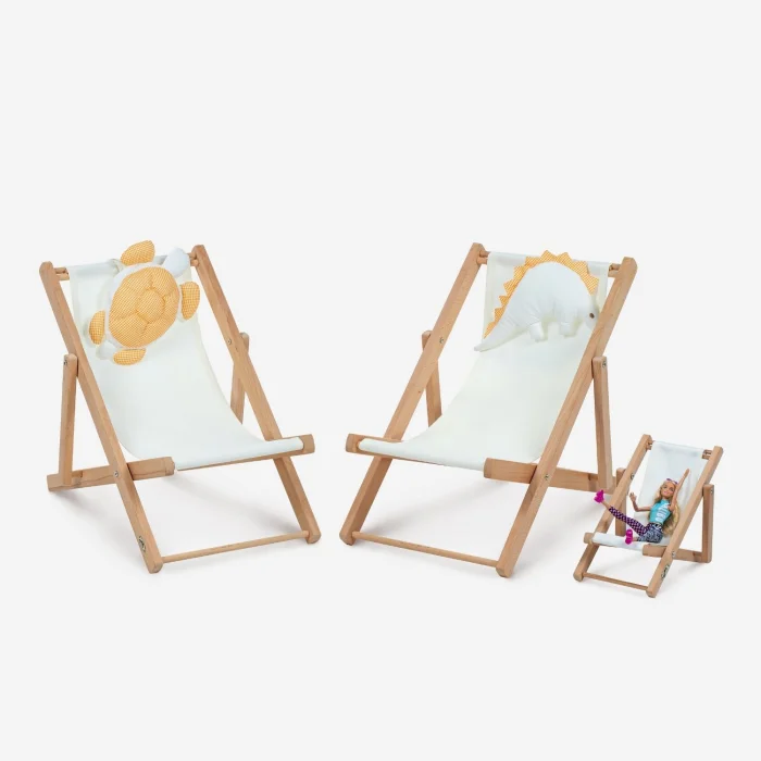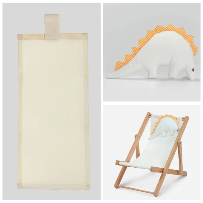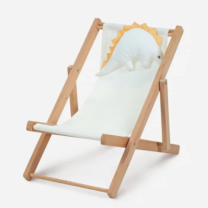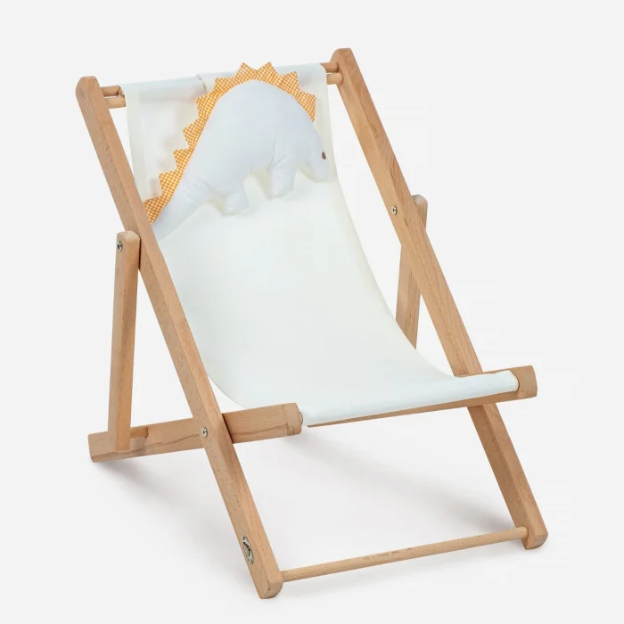Two-stage solid wood fun natural children's lounge seat. Dino pillow toy cream - beige plaid and cream cushion included.