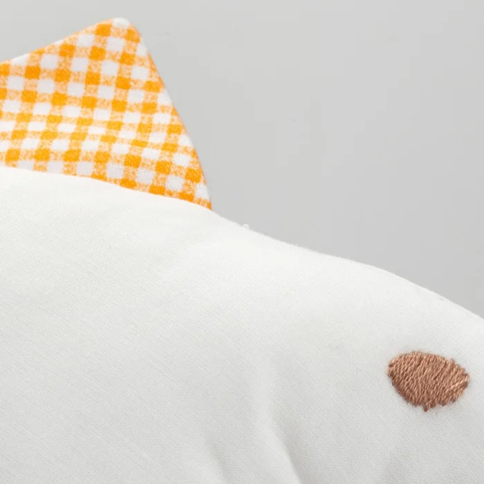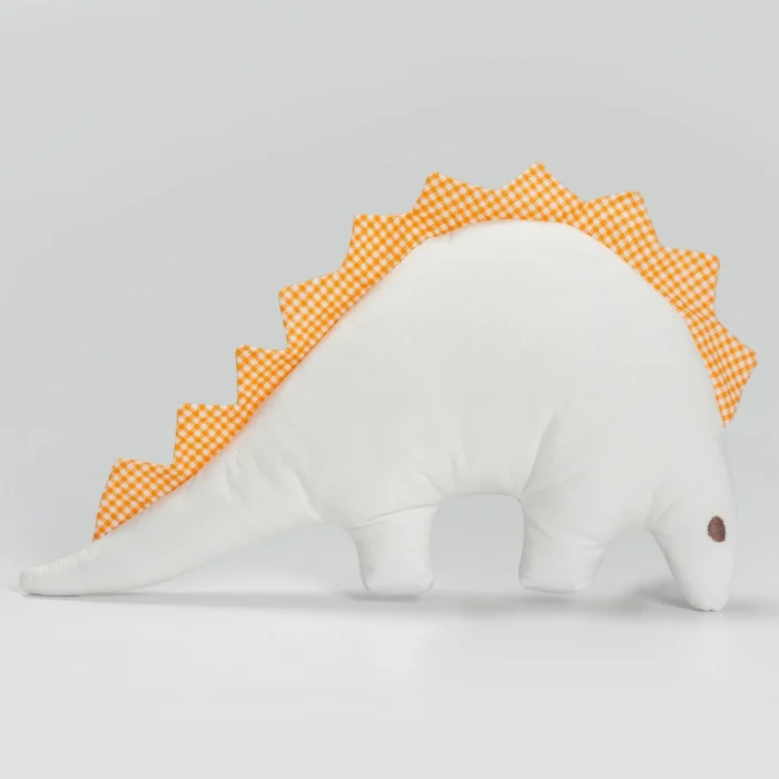 Dino pillow fiber filled, cream beige plaid, cotton thread hand embroidery on the eye. Dino pillow toy size, Width 34cm.