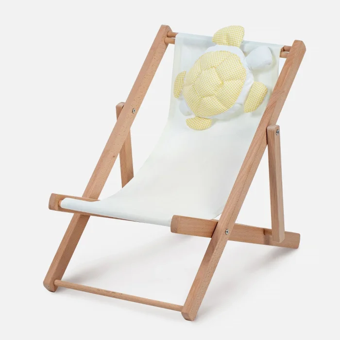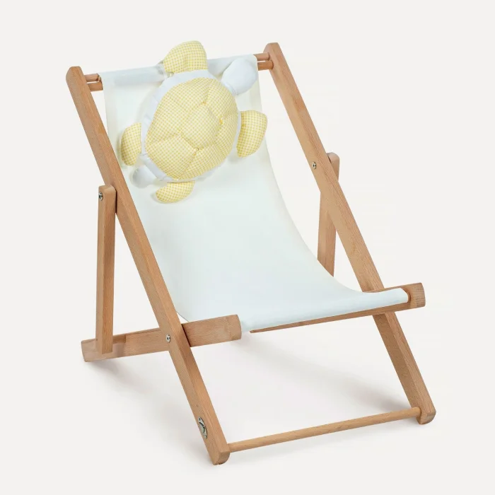 • Two-stage solid wood fun natural children's lounge chair. Champion Caretta Caretta pillow toy and cream cushion are included.