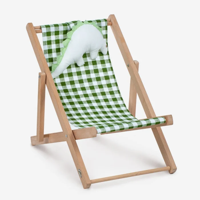 - Two-stage solid wood fun natural children's lounge chair. Includes a dino pillow toy and a pink-and-white striped cushion.